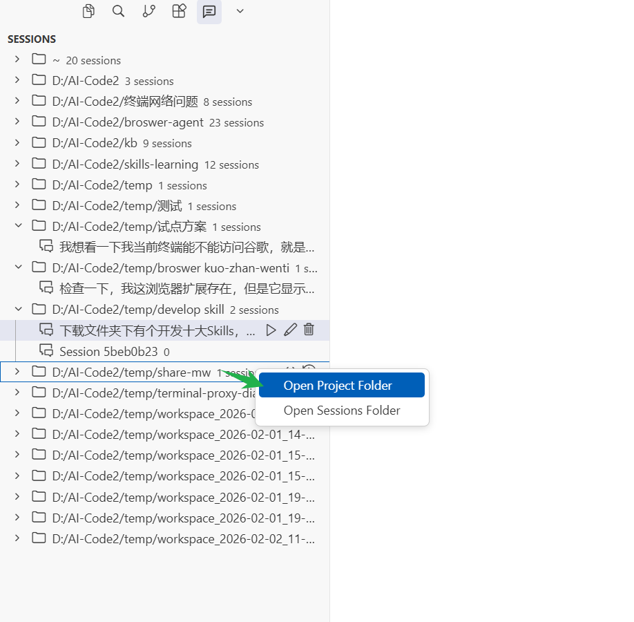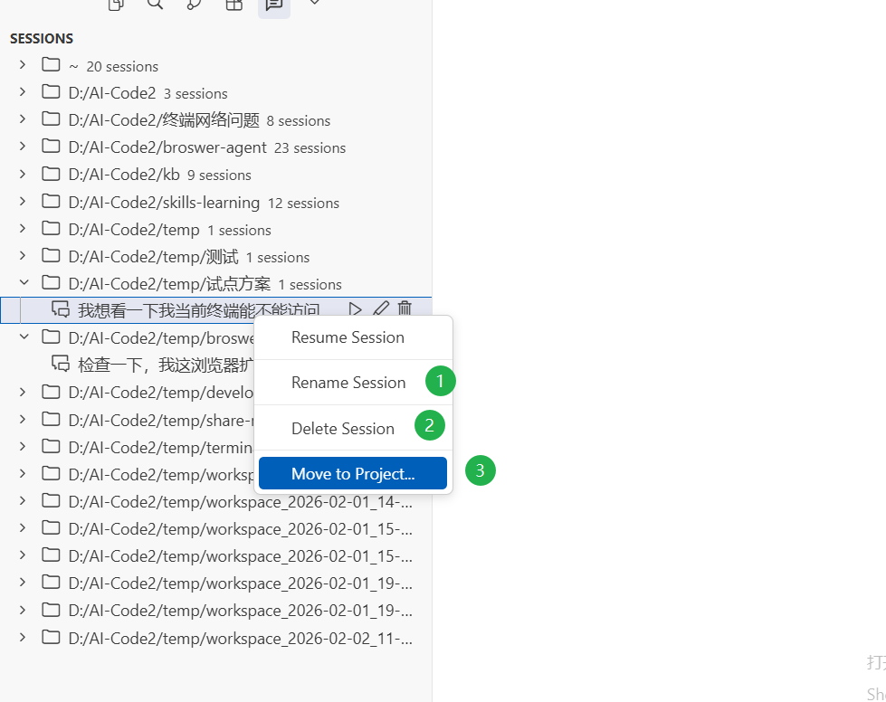 它的 resume 会话功能,鼠标右击后有两种打开方式。我通常会选择在 IDE 终端中直接打开——因为前面也提到过,用 Claude Code 的时候,我比较喜欢在终端里操作,也设置了个人快捷方式来启动。直接启动就能用,非常便捷。