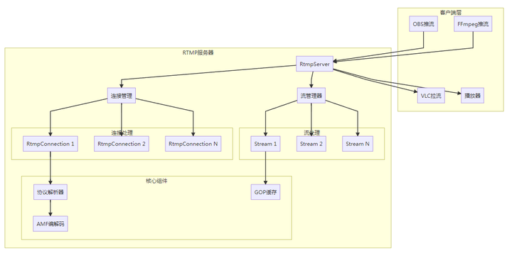 RtmpServer | 服务器主框架,管理TCP连接和配置 | rtmp_server.h/cc |