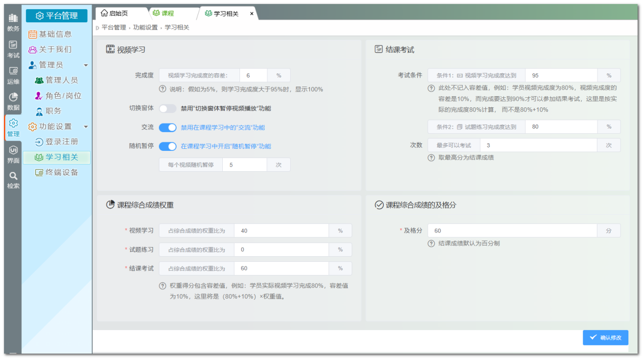 支持根据教学需求,为视频学习进度、试题练习通过率、结课考试成绩设置个性化权重比例,系统自动核算学员综合成绩,实现过程性评价与结果性评价的有机结合。同时可自定义结课考试参与条件,例如设置视频学习进度达标后方可参加考试,倒逼学员重视学习过程,构建科学的线上教学考核体系。