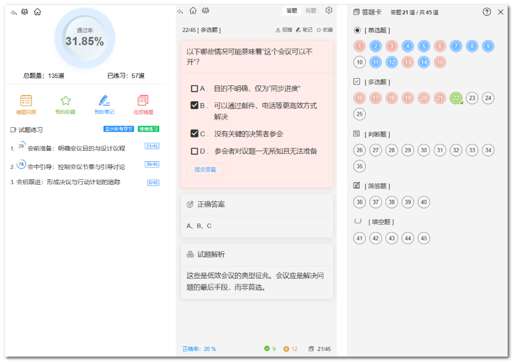 具备强大的题库管理能力,支持单选、多选、填空、判断、简答等常见题型的 Excel 批量导入与智能查重以及AI自动生成试题,大幅提升题库搭建效率。为学员提供章节练习、背题模式、错题回顾、高频错题专项、学员试题练习时,AI解析试题等功能,PC 端与手机端学习进度实时同步,打造轻量化、移动化的练习场景,助力学员高效巩固知识。