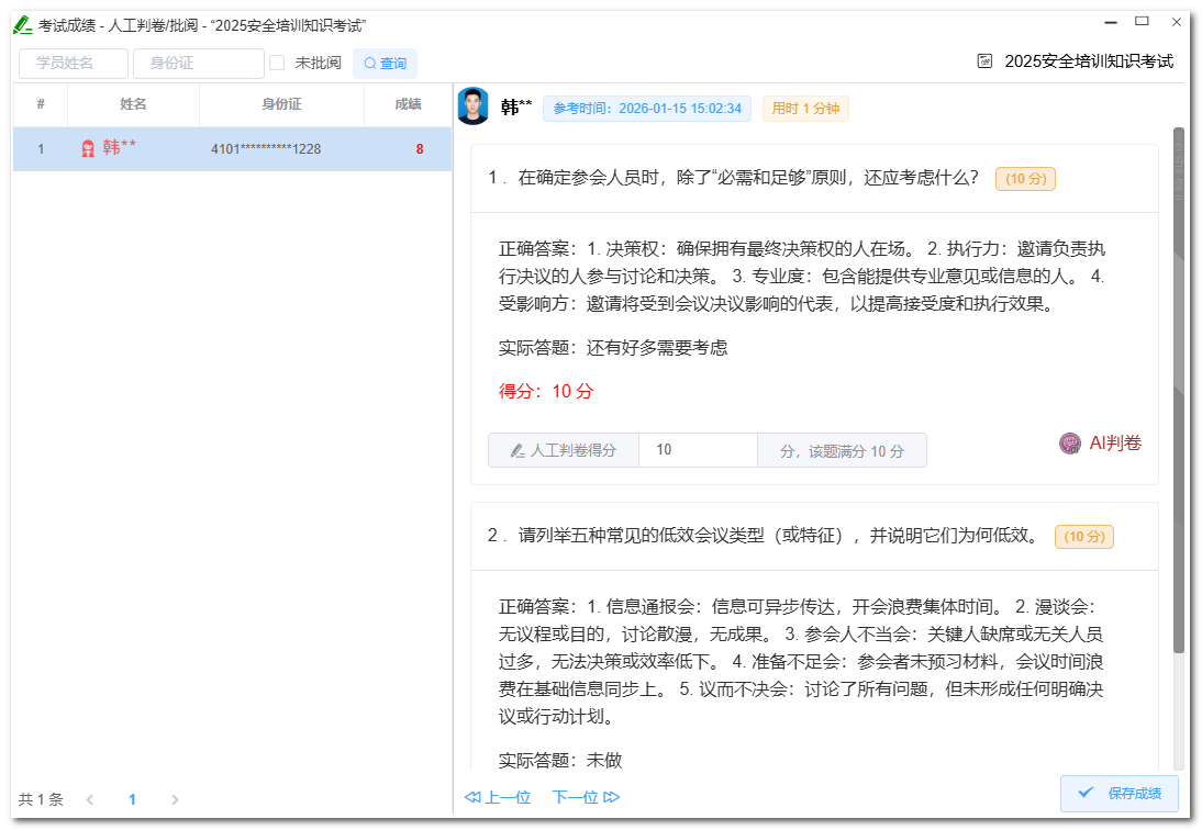 实现客观题系统自动批阅,主观题支持人工在线阅卷,阅卷完成后成绩自动汇总统计。考试后AI批阅试卷,简答题自动评分。管理员可批量导出考试成绩,针对修正答案后的试卷支持成绩重新计算,大幅减少教务与考务工作的人工成本,提升阅卷与成绩管理的效率。