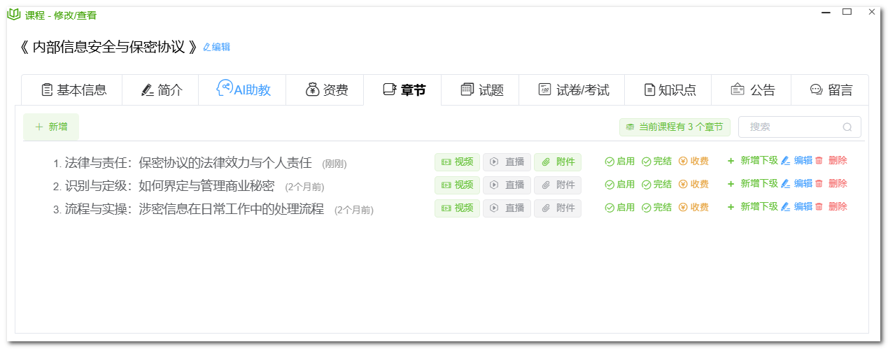 采用视窗化操作界面,课程编辑流程直观简单,支持拖拽式章节管理,无需专业的技术培训,教师与管理员即可快速上手完成课程搭建、编辑与管理工作,大幅降低平台的使用门槛与运营成本。
