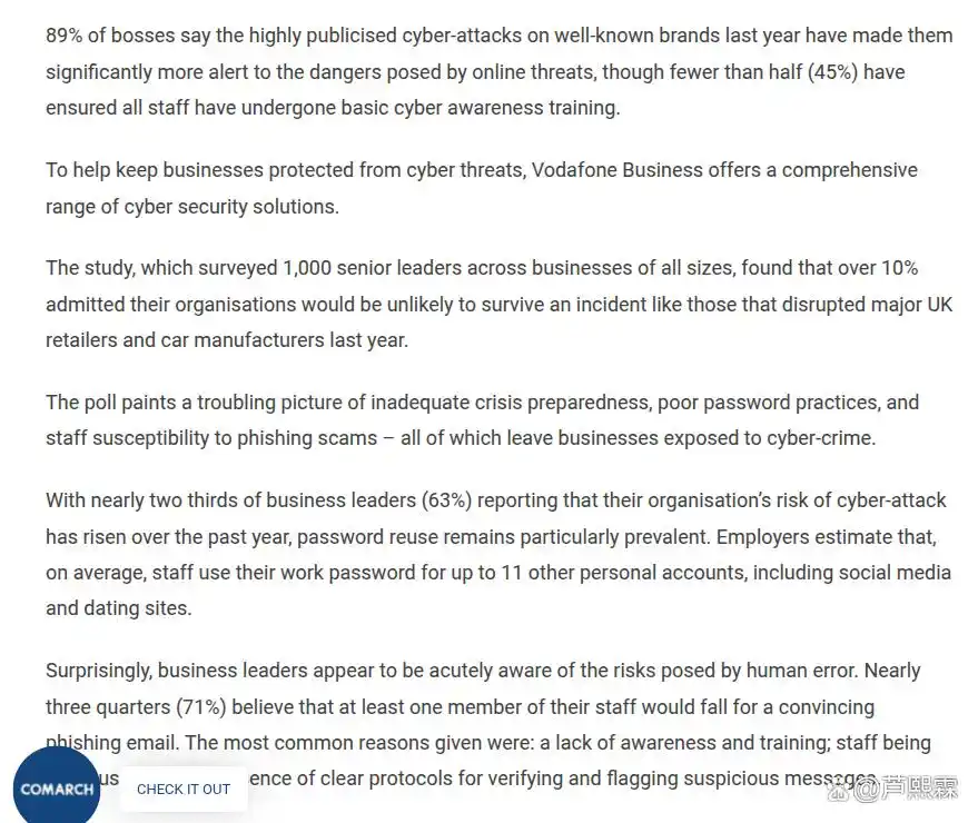 Vodafone Business的调查报告清晰地表明,尽管企业对网络威胁的认知度有所提升,但在将认知转化为有效的全员防御行动上仍存在显著滞后。员工在面对精心设计的钓鱼攻击时的脆弱性,依然是企业安全防线的最大短板,尤其对于资源有限的中小企业,这一短板直接关系到生存与否。