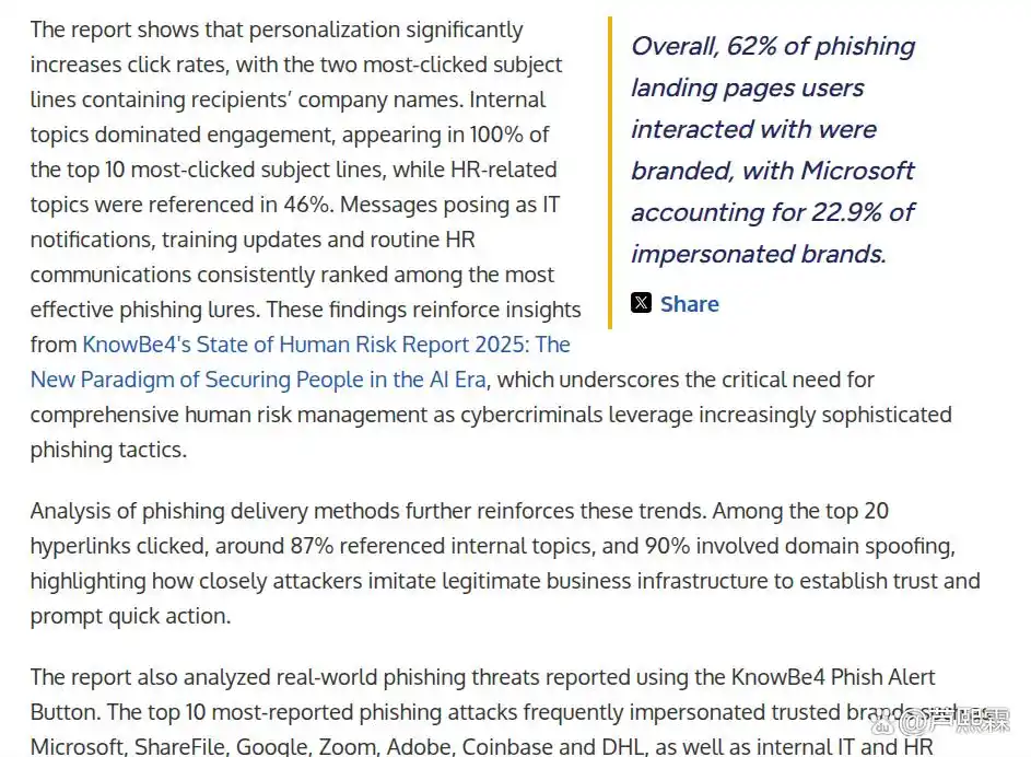 KnowBe4报告特别强调了HR和IT部门相关诱饵的高效性。这类攻击利用了组织内部的信任链和业务惯例: