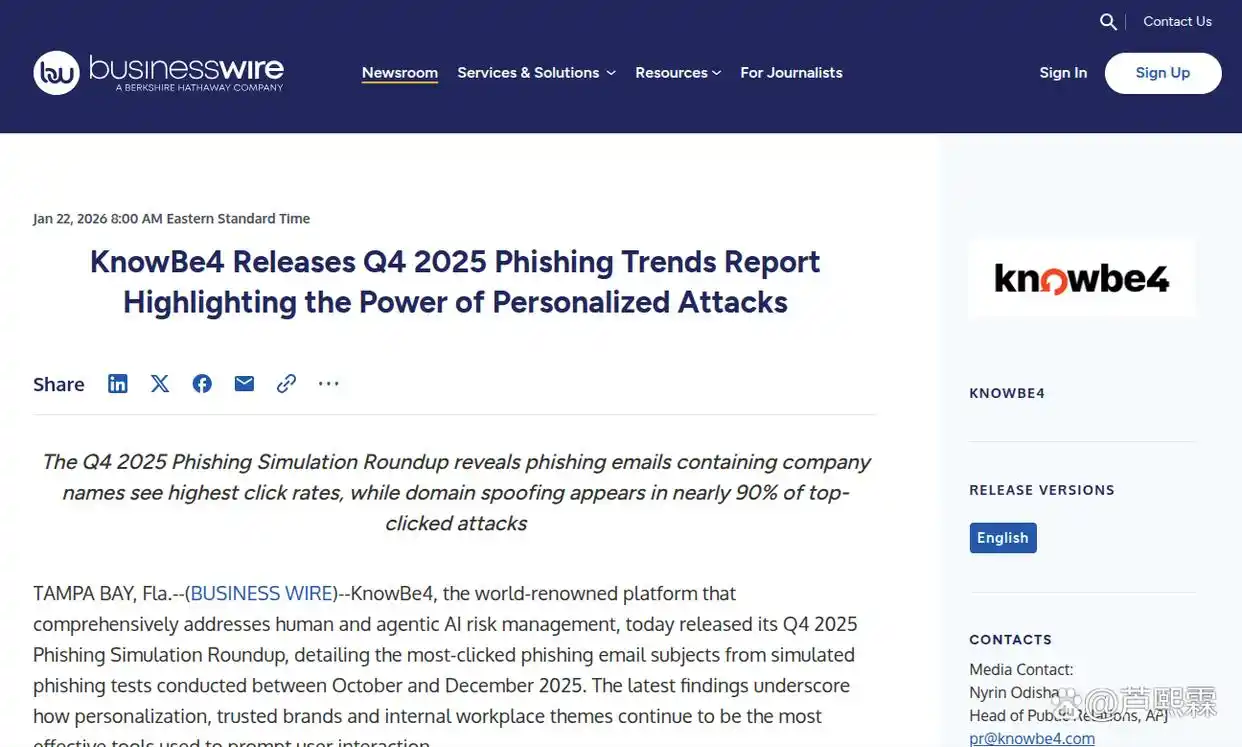 KnowBe4 2025年第四季度报告揭示的个性化钓鱼攻击趋势,标志着网络威胁已进入“精准制导”时代。攻击者利用数据丰富度、AIGC技术及域名欺骗手段,构建了极具迷惑性的攻击场景,使得传统防御体系面临严峻挑战。特别是针对HR、IT等关键部门的定向攻击,以及多向量协同作战模式,进一步放大了安全风险。