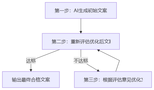 不达标 第一步:AI生成初始文案第二步:重新评估优化后文案输出最终合格文案第三步:根据评估意见优化文案