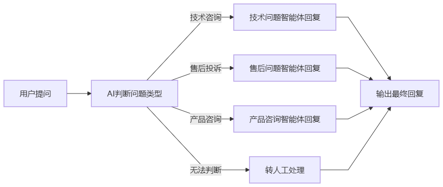 图例说明:路由式工作流核心是“先判断、再分流”,根据请求类型匹配对应处理主体,避免无效响应,提升效率。