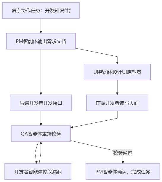 复杂协作任务:开发知识付费APPPM智能体输出需求文档UI智能体设计UI原型图后端开发者开发接口前端开发者编写页面QA智能体重新校验开发者智能体修改漏洞PM智能体确认,完成任务