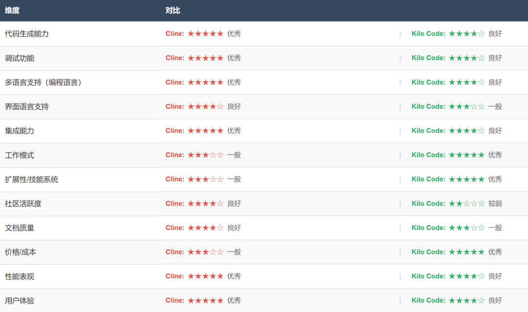 Kilo Code 的劣势:社区活跃度和文档质量较低,界面语言支持较弱,在某些核心功能如代码生成和调试上略逊一筹。