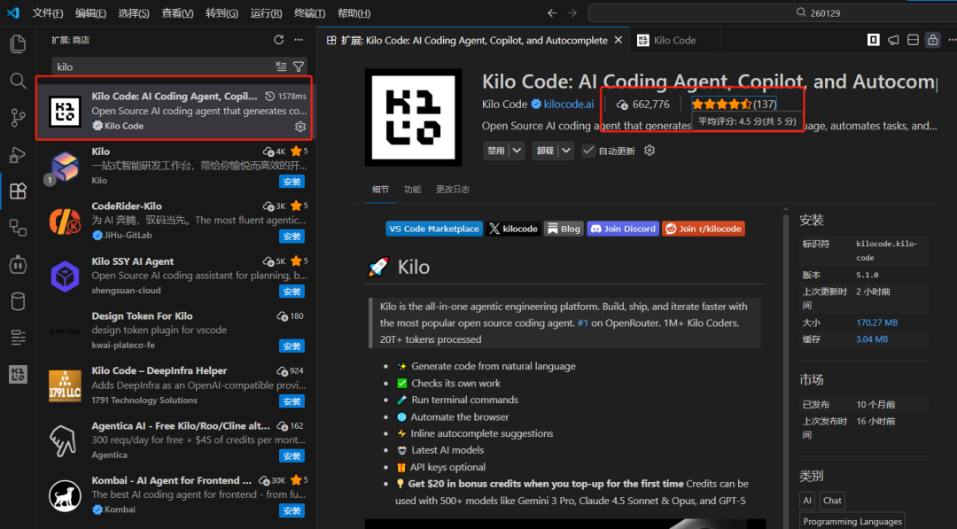 Kilo在VS CODE里面扩展很容易找到,使用方法很简单,只需要在扩展里面找到,并安装即可: