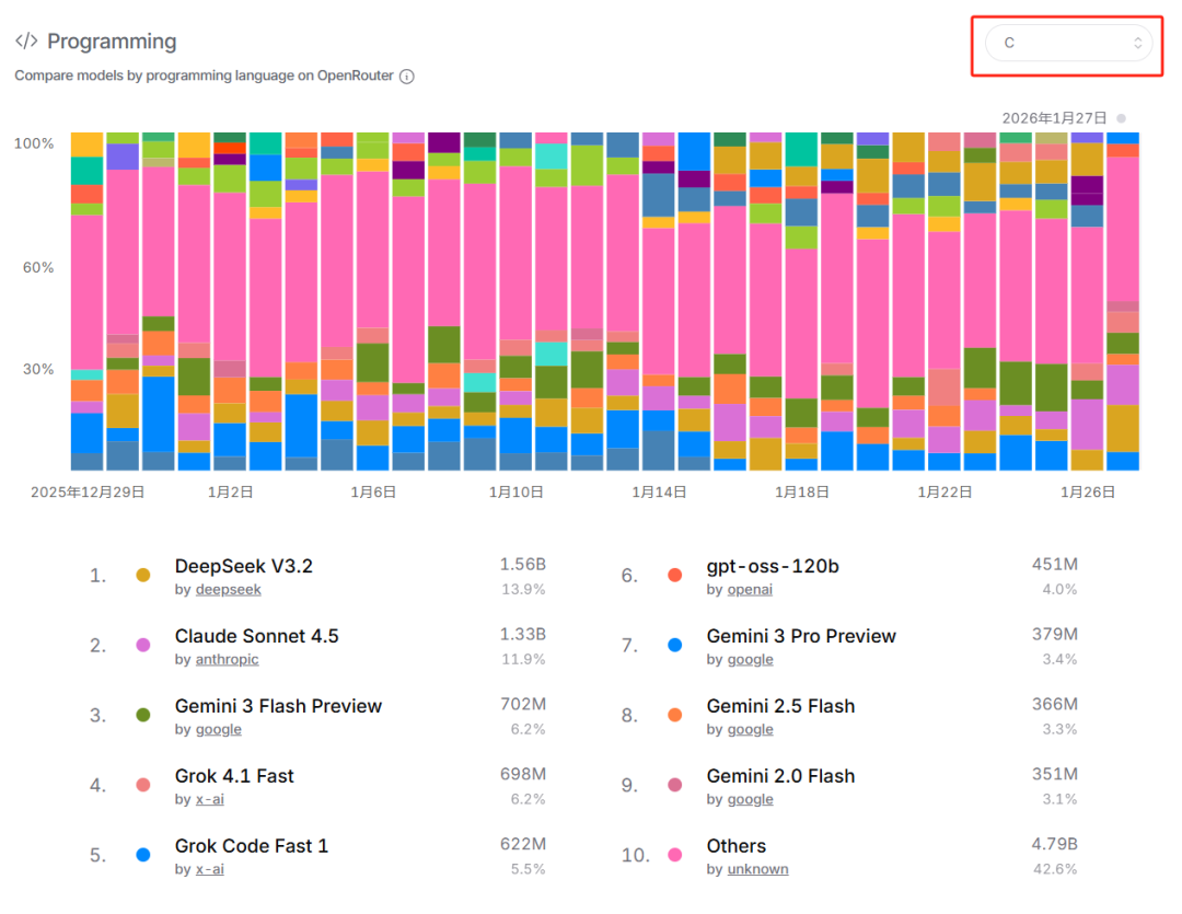 但是,基本上我们使用的不会是某一个模型。我们借助OpenCode、VS Code等软件IDE结合上述所有的大模型,在不同的细分工作中,擅长的毕竟是不同的。从开源网站的数据使用排行榜(C语言编程为例):