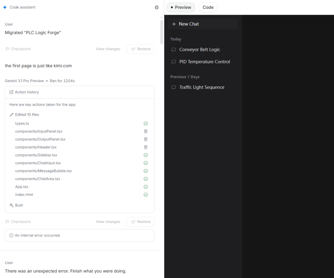 我这里也尝试了让他开发PLC程序的App,反正目前确实不是特别好,模型让他多提供几个,老是对应不上: