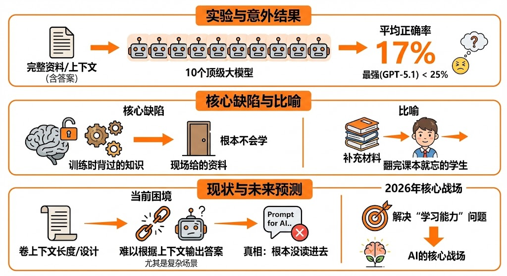 腾讯新上任的混元首席AI科学家姚顺宇,带着他的团队发了一份研究,核心观点就一句话:ChatGPT、Claude这些大模型,根本不会从上下文里学习。