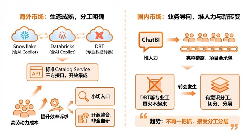 由于劳动力成本高,提升数据工程效率的诉求特别强烈,所以他们更倾向于选择小切入口,用开源生态的方式整合,不需要什么都自己做。