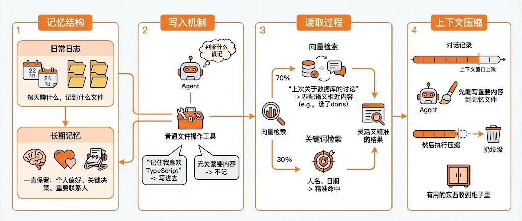 它在压缩之前,会先让Agent把重要的内容刷写到记忆文件里,然后再执行压缩。