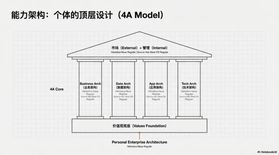 这是个人的“核心竞争力”区域,对应企业的 4A 架构。