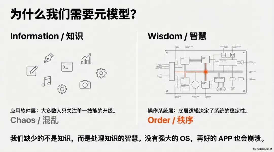 在信息爆炸和技术飞速发展的今天,我们缺少的不再是知识(Information),而是处理知识的智慧(Wisdom)。如果我们把大脑比作一台计算机,那么大多数人关注的是“应用软件”层面的技能(如编程、写作、营销),而忽视了底层的“操作系统”(Operating System)。