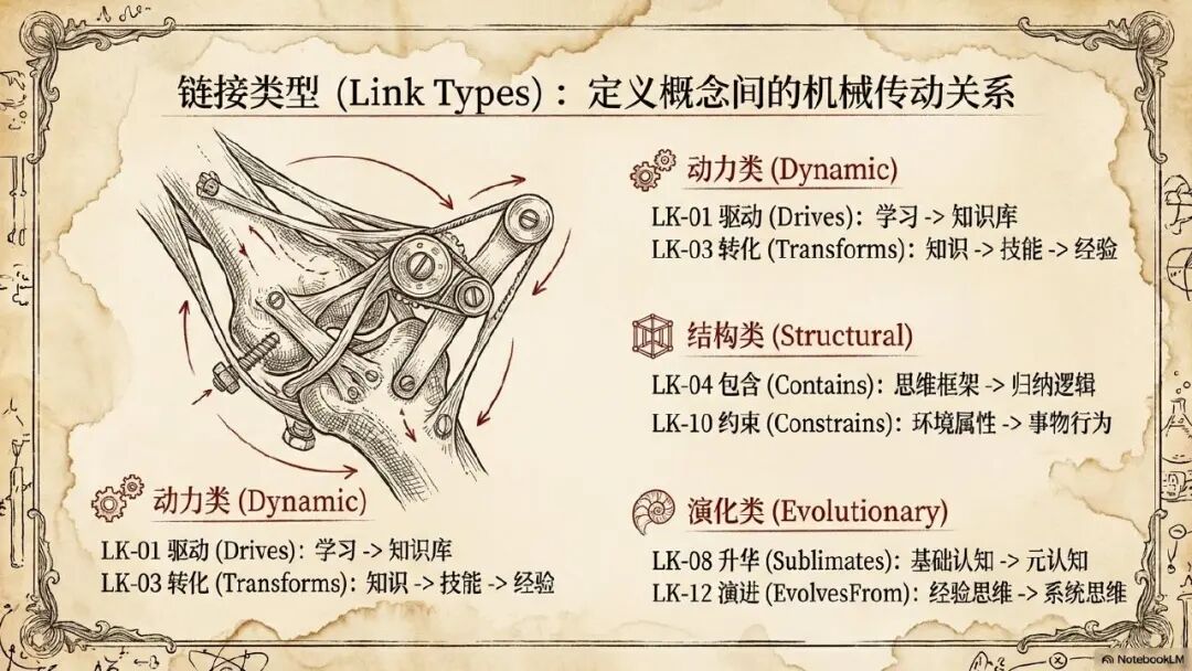 所以说在语义对象层还有一个叫链接类型。它就是定义概念间的机械传动关系。所以大模型帮我把我思维所有的文章的链接类型分为了动力类,结构类,演化类。这个分法我觉得也是相当的合理。类似于动力类,他就谈到你需要有驱动的链接,比如说通过学习驱动你的知识库的形成,你需要有转化的链接。比如说从资料库变到知识库,从知识库变到技能库,从技能库变到经验模式库,你里面还需要有静态的一些结构的链接,比如说有包含的关系思维框架包含了归纳逻辑演绎逻辑,还需要有约束的关系。