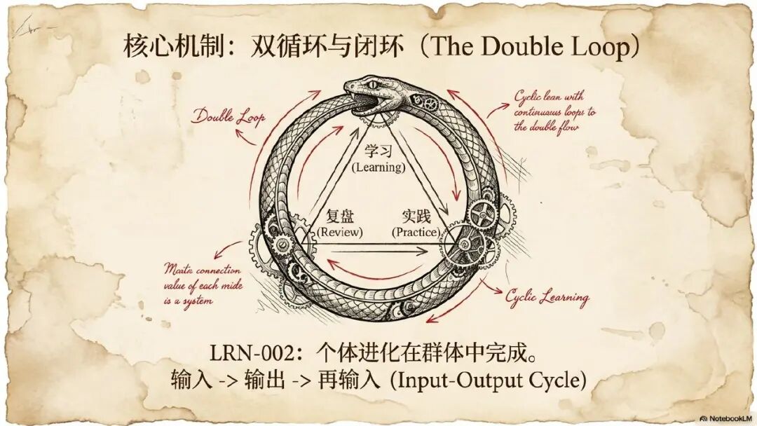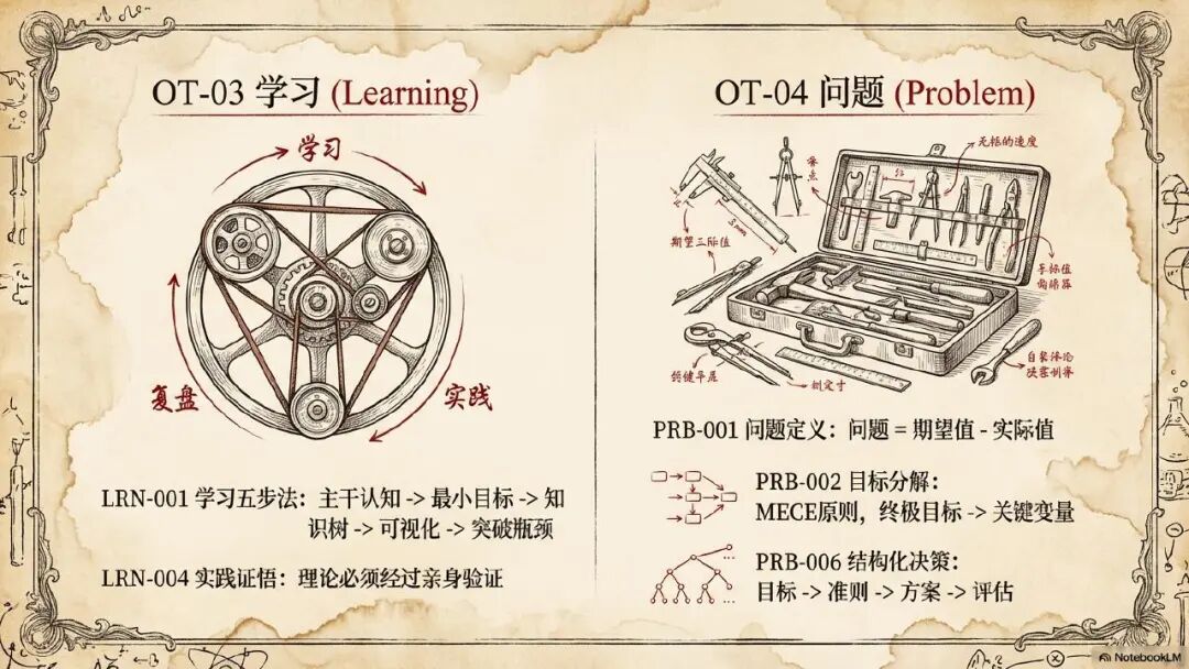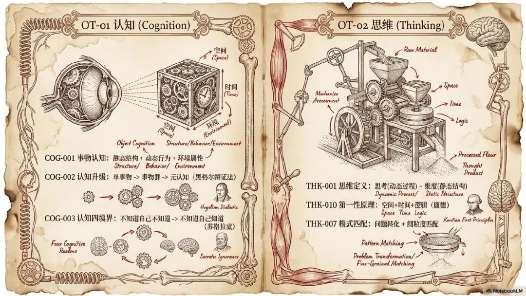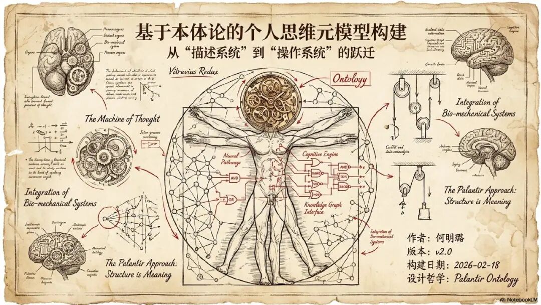 就是对于每个人来讲,他的思维和认知都不应该是简单的天马行空,胡思乱想,突发灵感,而是每个人的思维内部就像一个精密运转的机器和操作系统,它有内部的零件和组件有关联和依赖,有需要严格遵循的操作步骤和流程。我们需要将个人的思维从简单的描述系统变成一个精确化的操作系统。所以我在准备我这个材料,包括借助 notebookLM 输出 PPT 的时候,也是强烈的要求,增加了限制词,叫你参考达芬奇的绘图风格,帮我来输出这么一个完整的 PPT 介绍材料。