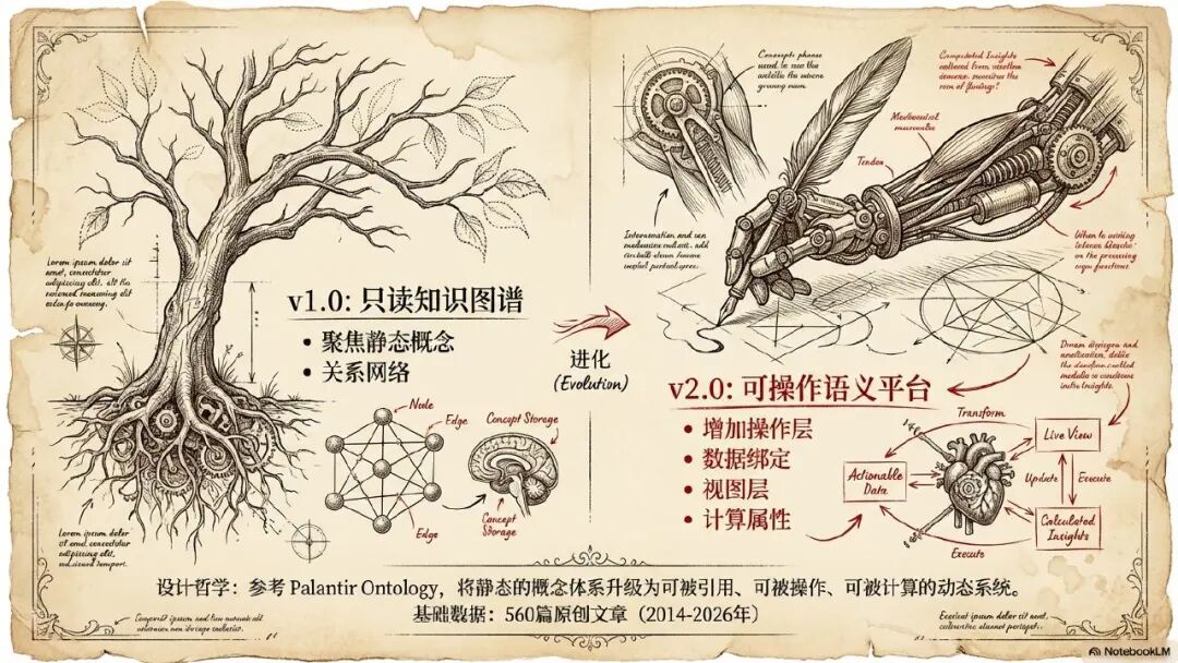 好了,言归正传。在我讲今天的内容之前,我前面其实已经出了一个 1.0 版本的思维元模型。这个思维元模型的思路也很简单,就是我借助大模型,让他通读我的 500 多篇个人思维的原创文章,让他自己去找到相关的文章。核心的知识点,知识点之间的关联依赖关系,去构建一个简单的知识图谱,这么一个思维的元模型,就体现了我核心的思维的观点和思想。但是到我今天讲的,它已经进化为一个新的 V2.0 的版本。为什么呢?因为原来的第一个版本,它其实不是有一个完完整整的动态的模型,或者是一个可操作的语义平台。因此在构建这个版本的时候,我也是借鉴了核心的本体论的建模的思想。大家都知道,本体论的建模思想本身就来源于知识图谱,但是它在知识图谱的基础上增加了核心的新的业务语义的定义,行为规则的定义。所以说通过这一些定义以后,它就进一步的提升了我整个思维元模型的质量。