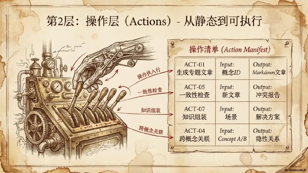 这个叫数据绑定层,接着就到操作层,操作层,大家可以简单的理解为类似于软件开发里面以对象定义的各种方法方法或者是叫行为都可以类似于你有可能是生成文章的操作知识组装的操作文章的一致性检查的操作,跨概念关联的操作回答问题的操作。这些都是操作有了操作层的定义,就让我们前面看到的简单的,静态的对象对象关系变成了一个从静态到动态可执行的这么一个行为,这个是核心的操作层的定义。