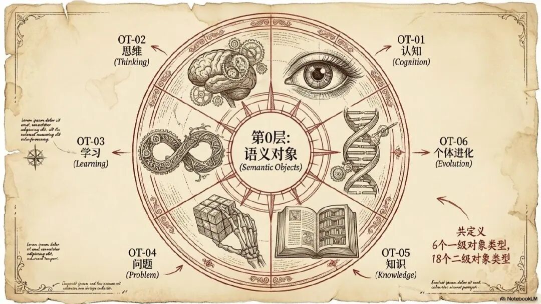 好了,然后我们接着分层来展开看一下每一层它究竟是干什么用,首先是第0层,第0层其实就是叫做语义对象层。语义对象层通过整个大模型的分析和建模,他把我所有思维类的文章阅读完了以后,他构建了6个一级对象和 18 个二级对象,一级对象就包括了认知个体进化知识问题学习思维。其实这一些一级对象跟我谈到的思维框架模型相当类似,因为我在思维框架模型里面就将思维分为了事物认知和问题解决两条主线。同时通过学习实践复盘,构建一个完整的从资料库到知识库,从知识库到经验模式库的逐层迭代的升级闭环。所以 AI 大模型也完整的理解了我的思维框架模型,构建了这么一个语义对象层。