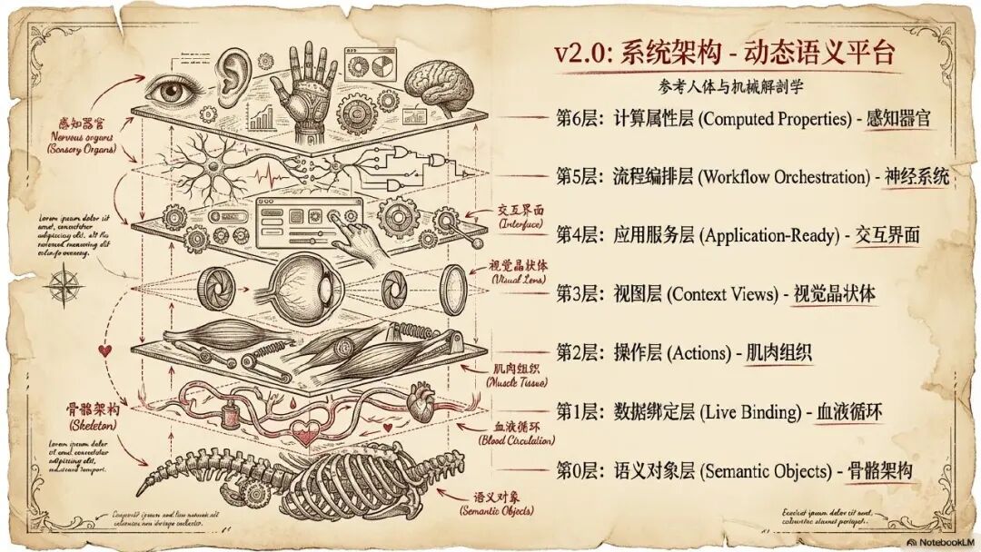好了,我们再来看,通过 AI 大模型辅助以后,我们形成的一个完整的 V2.0 版本的思维元模型的系统架构。我把它叫做动态的语义平台,它也是参考了人体和机械的解剖学,构建了一个横向七层分层的完整架构。