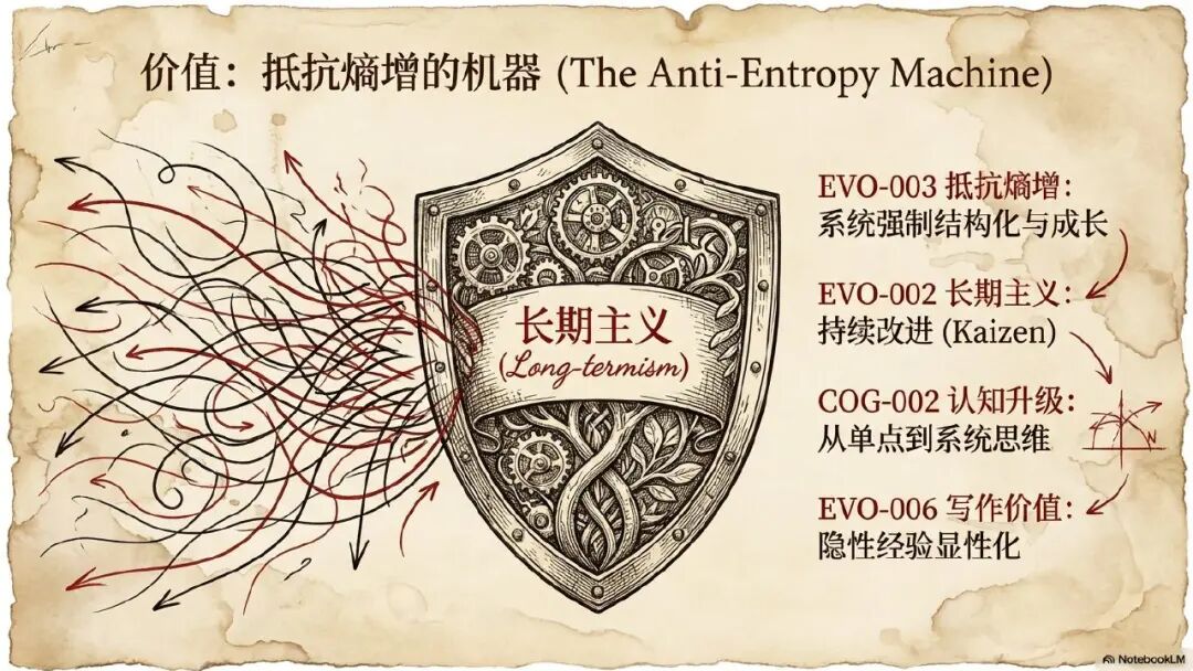 所以基于我上面刚讲到的整个核心的思维元模型集成架构,它的核心机制就是需要去构建一个双循环和闭环机制,去实现学习实践复盘的闭环,去实现从知识库到经验库到方法模式库的持续进化升级的这么一个闭环。当然整个 AI 大模型帮我分析,我构建这套思维元模型的目的是构建了一个能够抵抗熵增长期主义持续改进的这么一个内容。但是我个人核心的理解就是什么呢?构建这么一个思维元模型其实就是对于你个人核心价值的一个抽象化沉淀,通过 AI 辅助进一步的提升你的认知能力。