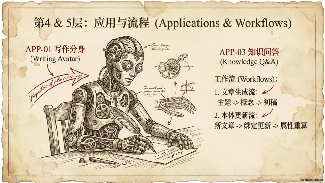 在视图层上面就是我们说的叫应用与流程层。构建完了我的思维元模型以后,那么怎么用呢?它有可能是我个人的一个写作分身,也有可能是一个 AI 的智能知识问答的助手都有可能,因为你面对的不同的应用场景。但是所有的场景你会发现所有场景都是我底层我思维元模型对象行为操作能力的主张,比如说我现在是一个文章生成的这么一个场景,我可以构建这么一个 workflow让 AI 首先去理解我需要生成文章的主题。然后拆分概念,将这些概念匹配到我的对象,然后再去进行知识的组装,最后要用写作操作形成这么一篇文章。这个其实就是我们讲的应用和流程层,他可能千变万化,但是他底层的思维原认知元模型能力从来就没有变过,它只是不同思维能力的灵活的调用和组装而已。