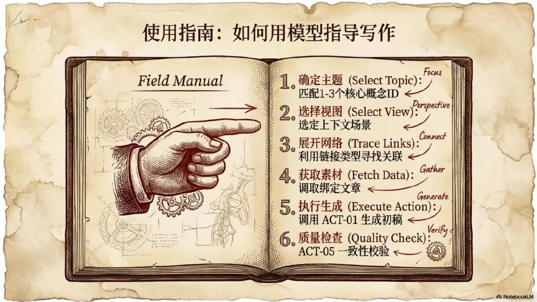 好了,最后一个点就是具体的使用指南。我在前面也讲过了,就是整个模型的使用指南,它可以分成关键的六大的步骤,第一个就是基于不同的场景确定主题。你就是是想回答一个问题,还是是写一篇文章。然后基于不同的主题,选择核心的视图,也有可能选认知视图,也有可能选学习视图,然后基于视图展开网络,利用连接类型寻找到核心的对象和关联。第四步就是根据数据绑定连接,找到追溯到我的历史原文章,提取关键的内容。第五步,进行知识的组装,完成知识片段的初稿的形成成最后进行质量检查,形成一篇完整的文章。