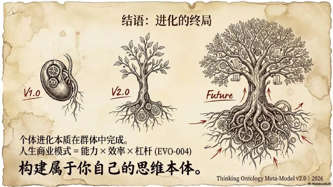 所以我一直强调整个思维进化思维模型的进化,他核心的终局究竟是什么呢?因为从 1.0 到 2.0 的进化,我们已经从一个静态的模型变成了一个动态的语义模型。那么 2.0 到将来未来的进化,它应该变成一个能够持续自我进化的模型,这个才是我们真正需要的思维模型进化的终极目标。