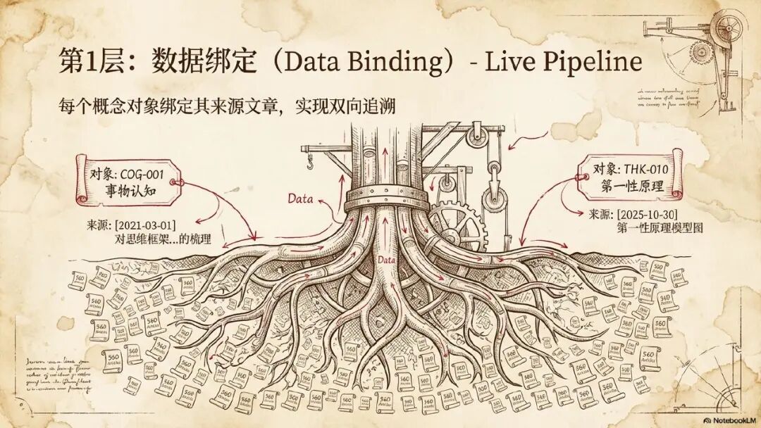 有了这个知识图谱以后,我们又回到核心的第一层,第一层,在这里它把它叫做数据绑定层,这个低层数据绑定就会让我的思维元模型明显的带有我个人的色彩,因为数据绑定层它就实现了我抽象的核心的对象概念。怎么样跟我的历史文章之间建立一个双向链接,双向追溯的关系。