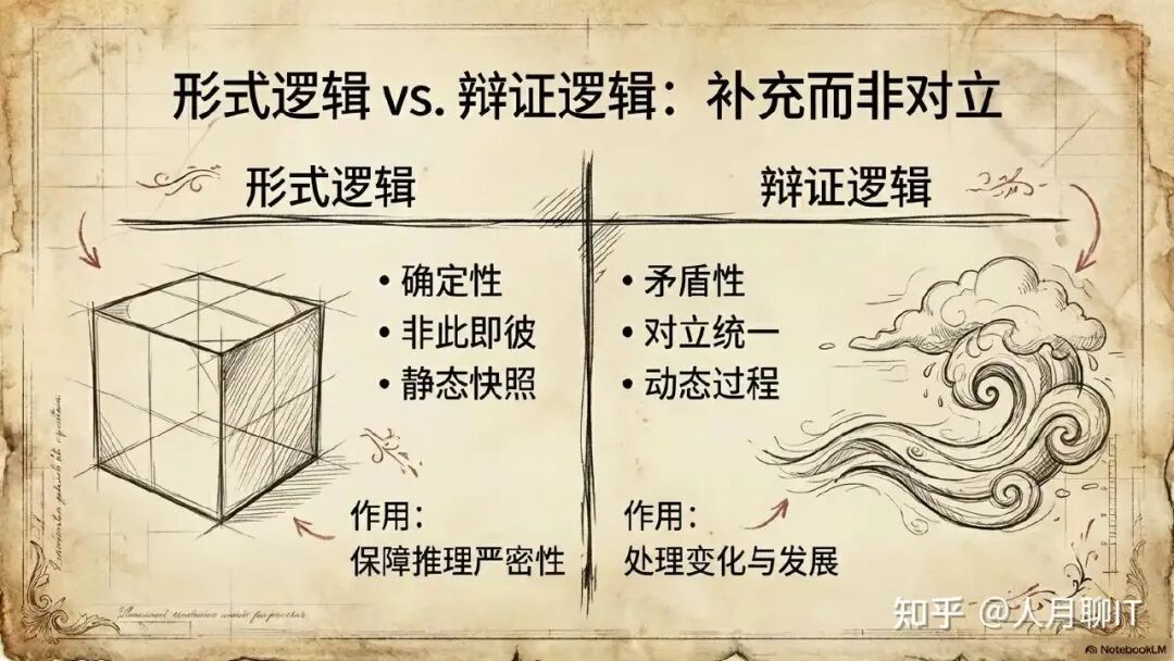 辩证法与逻辑学不是对立的关系,而是补充与超越的关系。形式逻辑在确定性、静态性的分析场景中极其有效,它保障了推理的严密性。但当分析对象涉及变化、发展、矛盾时,单靠形式逻辑就不够了——你需要承认矛盾的存在,理解对立面之间的相互转化,并在更高层次上寻求统一。