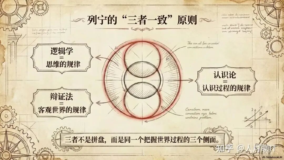 这背后有一个深刻的哲学洞见。黑格尔的哲学体系由逻辑学、自然哲学和精神哲学三部分构成,但这里需要特别指出:黑格尔所说的”逻辑学”(即《逻辑学》,Wissenschaft der Logik)不是我们前面讨论的形式逻辑,而是一种融合了本体论(存在的本质是什么)、认识论(如何认识存在)和辩证法(存在如何运动发展)的”大逻辑”。在黑格尔那里,思维的规律和存在的规律是同一的,逻辑范畴本身就包含了辩证运动。列宁在研究黑格尔后,在《哲学笔记》中明确提出了一个重要命题:辩证法、逻辑学和认识论是”三者一致”的——不是三个独立的学科凑在一起,而是同一个把握世界的过程的三个方面。辩证法作为客观规律的反映、逻辑学作为思维规律的表达、认识论作为认识过程的展开,三者在根本上是统一的。这个”三者一致”的判断,实际上是理解四者关系的最深层钥匙。