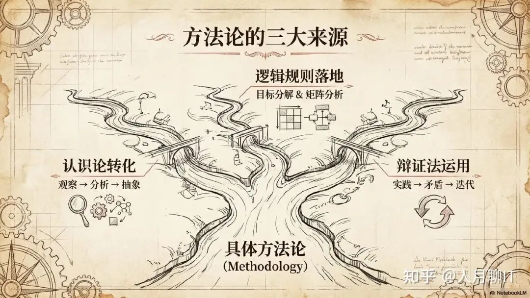 个人的理解是,方法论不是凭空产生的,它有三个来源。第一是认识论的原则转化。认识论告诉我们认识需要从感性到理性、从现象到本质,方法论就把这一原则具体化为”先观察、再分析、后抽象”的操作步骤。第二是逻辑规则的应用落地。逻辑学提供了归纳和演绎两种基本推理方式,方法论将其转化为具体的分析框架,比如目标分解(演绎)、案例归纳(归纳)、矩阵分析(组合)等。第三是辩证法思想的实践运用。辩证法揭示了事物的矛盾运动规律,方法论将其转化为”先建立认知、再在实践中遇到反例、最后整合为更高认知”的实践闭环。