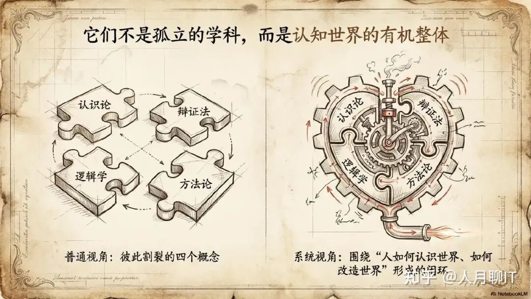 到这里,我们已经分别讨论了认识论、逻辑学、辩证法和方法论各自的角色。但更重要的是理解它们如何形成一个统一的闭环体系。