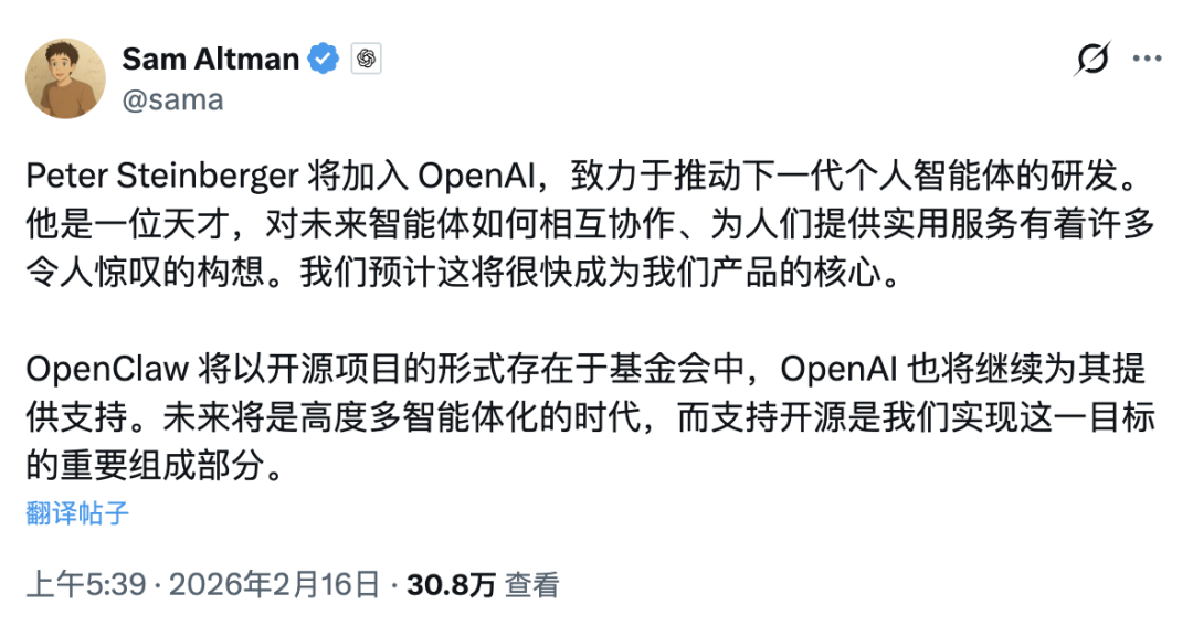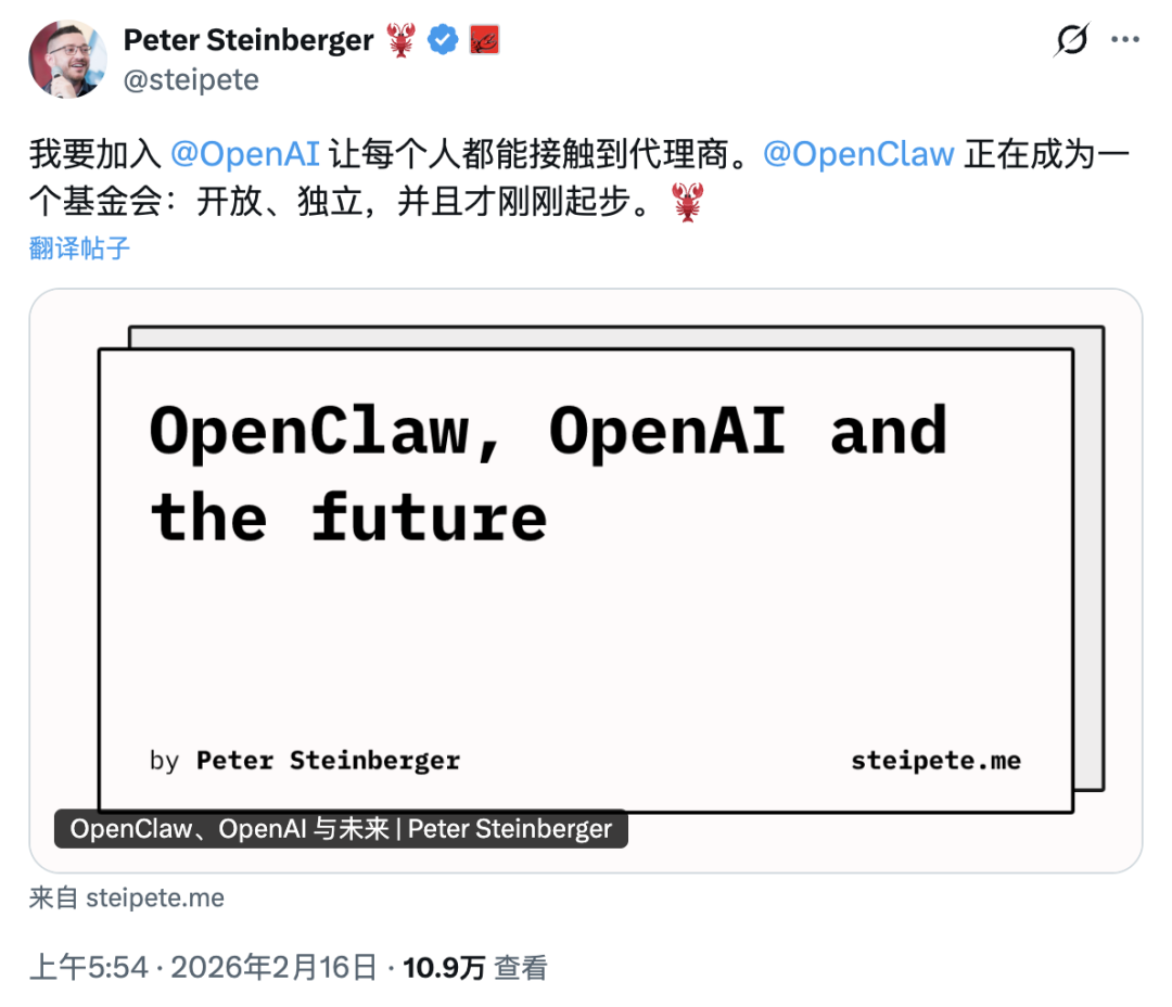 OpenClaw 会转成一个基金会,继续开源。Steinberger 自己加入 OpenAI 的研究团队。