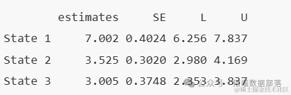 一个相关的量,平均逗留时间,是指每次访问每个状态时预期的平均持续时间。由于我们假设了一个渐进性疾病模型,其中每个患者只访问每个状态一次,因此估计值应接近在每个状态中花费的总时间。然而,Jackson指出,在渐进性模型中,疾病状态的逗留时间将大于疾病状态的预期停留时间,因为在一个状态中的平均逗留时间是基于进入该状态的条件,而患病状态的预期总时间是对一个个体(可能在患病前死亡)的预测。这正是我们在状态2和3中看到的情况。