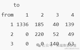 状态转换表显示了在不同观察时间点,每对状态被观察到的次数。从表中可以看出,有46次从状态2(轻度CAV)转移到状态1(无CAV)的情况,有4次从状态3(重度CAV)转移到健康状态,以及13次从重度CAV转移到轻度CAV的情况。