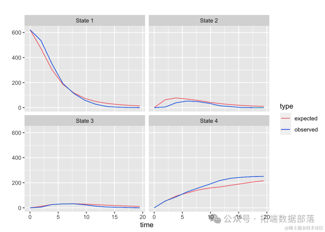 从图中可以看出,状态1到3的观测患病率和预测患病率吻合得相当好。