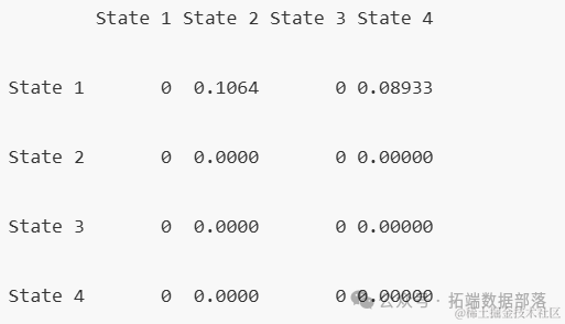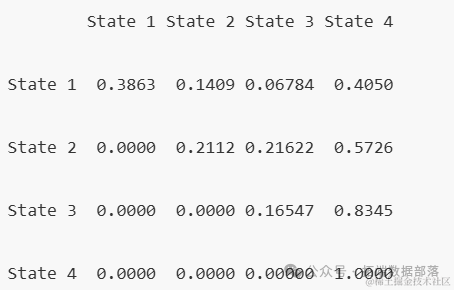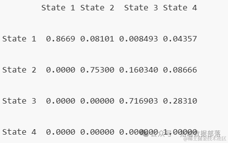 我们同样可以查看不同时间点的状态转移矩阵,并观察这些概率如何随时间变化。这里我们计算了1年时的转移矩阵。