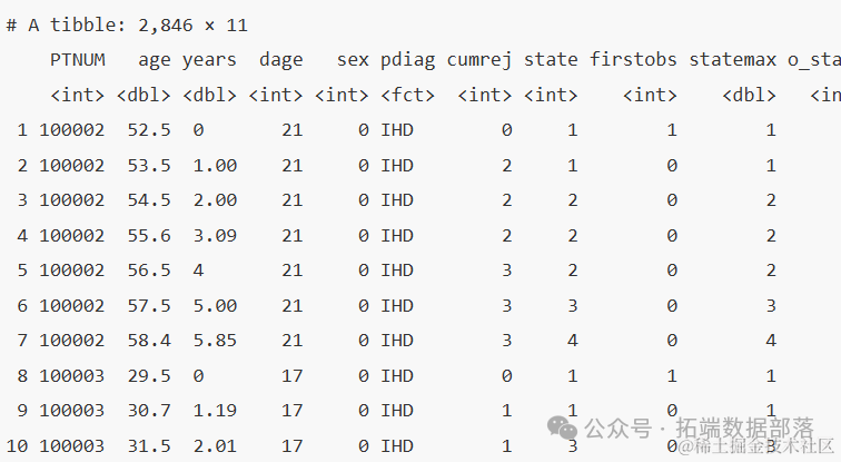 以下代码创建了一个新变量,该变量保存了每个观察值的原始状态数据,并以tibble格式显示数据。
