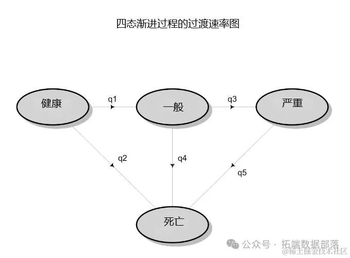 以下图表展示了一个可能的疾病进程模型,其中在任何状态下都有一定的死亡可能性,但除此之外,患者将从健康状态发展到轻度疾病,再到重度疾病,最后可能是死亡。