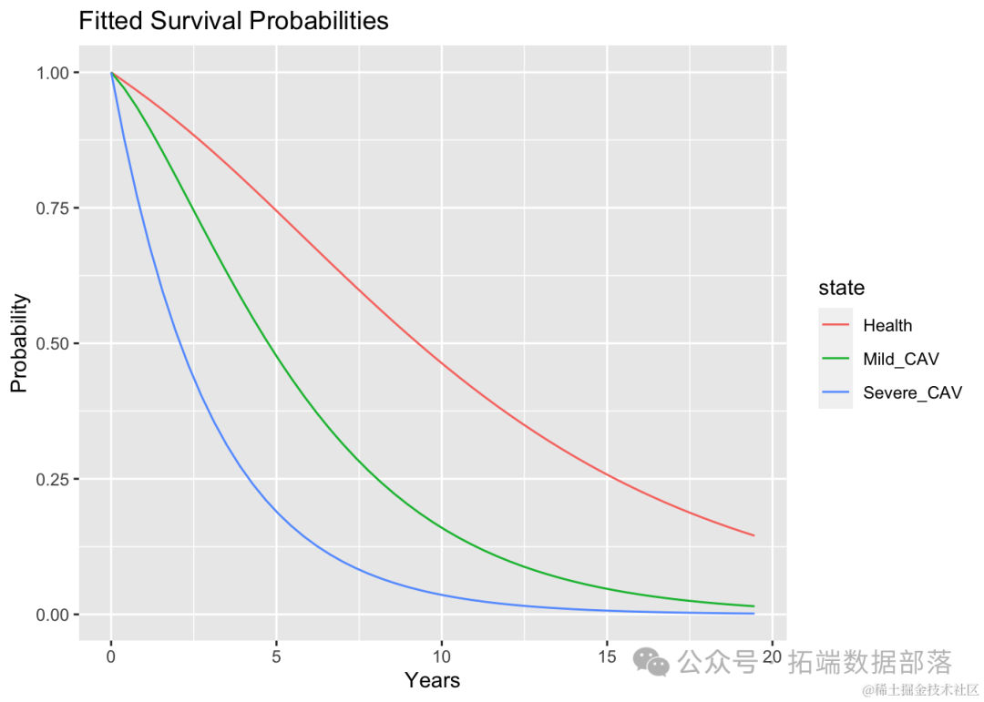 的确,马尔可夫假设意味着患者在各种状态下所花费的时间是呈指数分布的。然而,随机多状态过程的数学理论非常丰富,可以容纳随时间变化且依赖于状态的更现实的风险率模型,以及其他对马尔可夫假设的放宽。此外,R语言(以及其他语言)中有强大的软件使多状态随机生存模型变得实用。