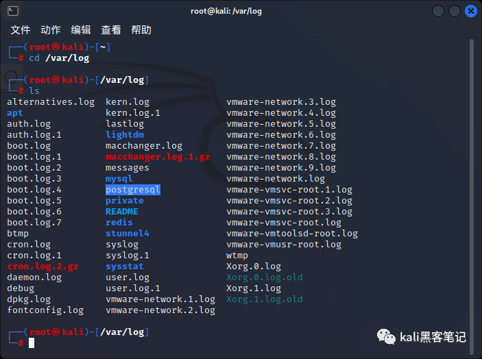 Linux 大多数日志文件就是文本,常见痕迹清理位置:/var/log。如下图,日志比较多。