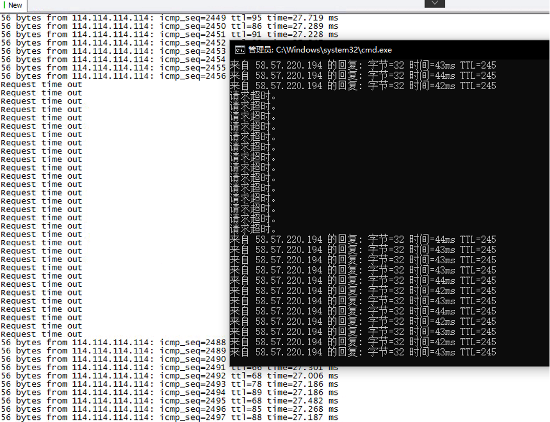 在内网的机器上面ping外网,大概过10分钟左右就会出现请求超时的情况,所以这个时候需要判断到底是内网问题从而导致外网丢包,还是内网没问题,外网的故障,所以在这个时候做了几个操作