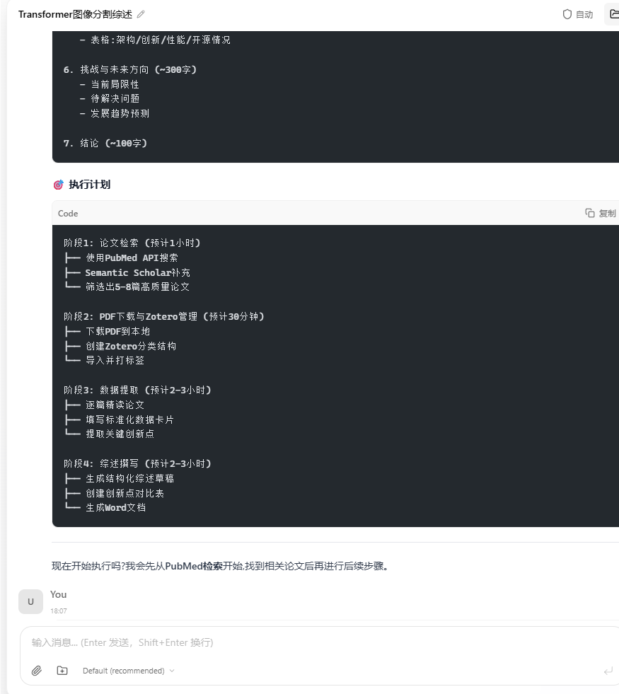 "以 'Transformer 在生物医学图像分割中的应用' 为题,搜索 2023-2026 年 顶级期刊论文,下载 PDF,用 Zotero 分类,提取每篇的核心方法、数据集、SOTA 指标,最后生成一份 3000 字 的结构化综述,包括创新点对比表。"