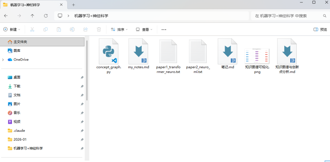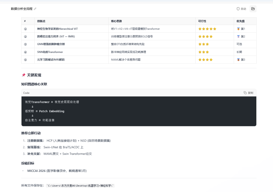 "打开我电脑里 '机器学习 + 神经科学' 文件夹的所有 PDF 和笔记,提取关键概念,构建知识图谱,找出 3-5 个潜在创新交叉点 ,并为每个点生成可行性实验设计草稿。"