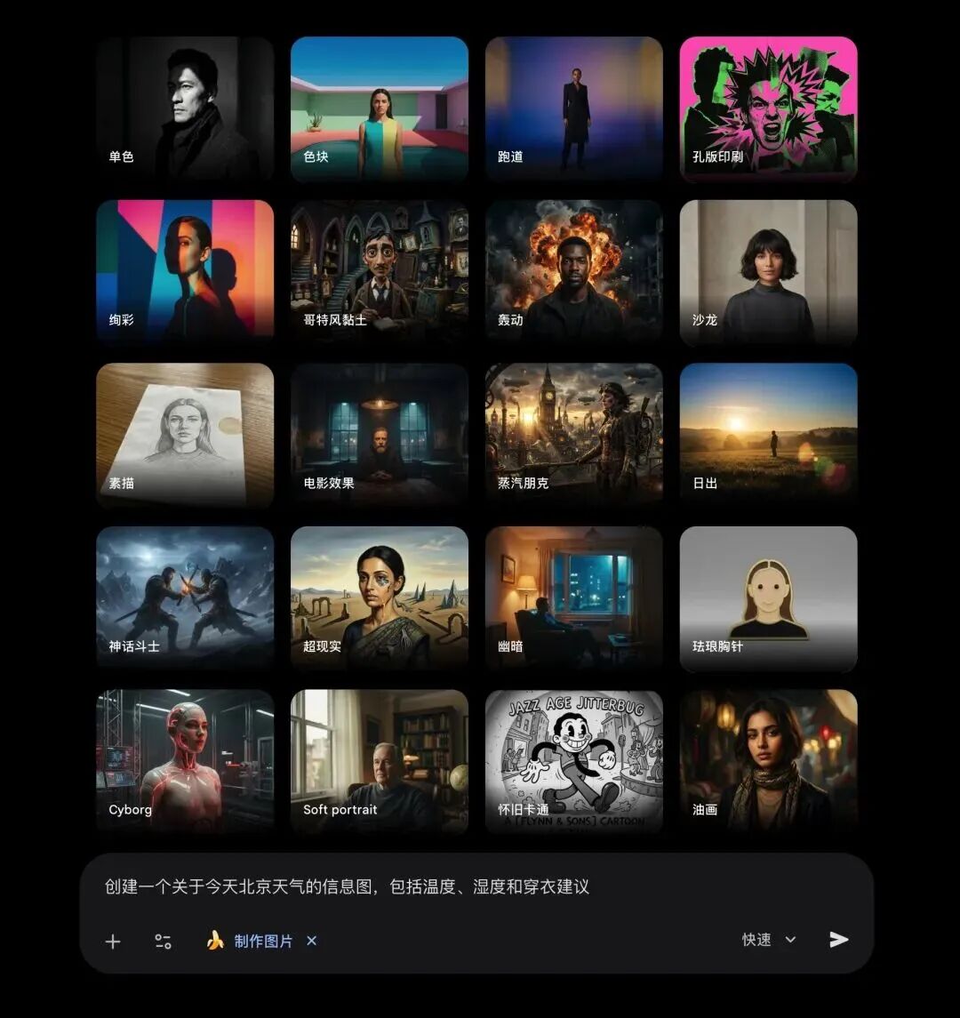 模型可以从Google Search获取实时信息和图像。这意味着什么?意味着你让AI画“今天北京的天气”,它不会给你瞎编一个“晴转多云,25度”,而是真的去查一下,然后把真实数据画出来。