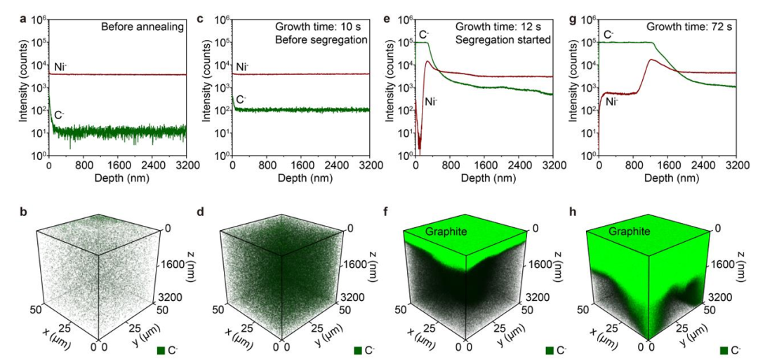 图2利用飞行时间二次离子质谱(ToF-SIMS)对碳在镍中的时空分布进行了三维追踪。a,b,原始镍箔中几乎探测不到碳信号。c,d,经过10秒生长后,碳信号已均匀分布于整个镍基体,表明在析出发生前,碳已迅速体相溶解。e,f,在12秒样品中,表面开始出现石墨层,直接证实了碳析出发生在10-12秒的关键窗口内,揭示了极快的相变动力学。g,h,生长72秒后,形成了~800 nm厚的连续石墨薄膜。特别地,h显示在镍的晶界沟槽处石墨局部增厚,表明晶界缺陷作为快速扩散通道,加速了碳的偏析与成核,进一步证实了非平衡状态下碳的超快输运特性。